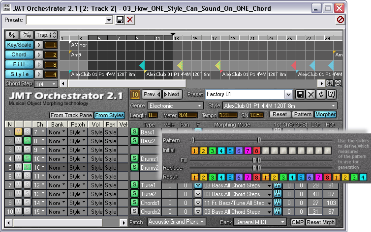 - by shifting chord steps and choosing Morphing modes, independent for